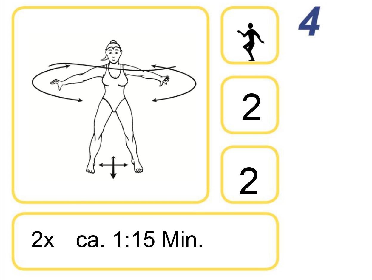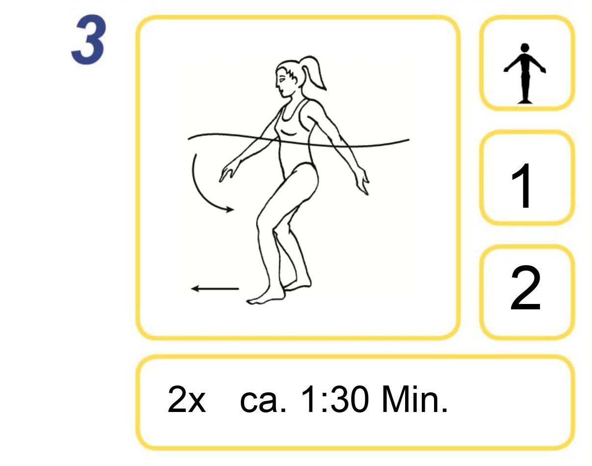 • Variante 1: am Ort, Arme hüfthoch, Füße unten (2x je 1:15 Min.)