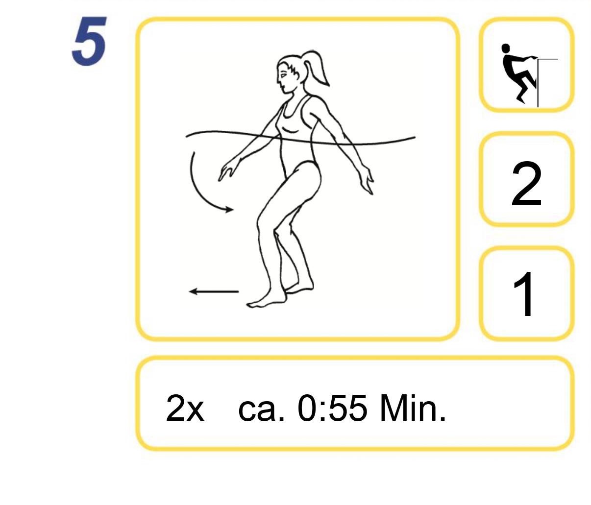 Übungstafel Übung 5 zum Aqua In Audiotraining Kurzprogramm, gelb umrahmt sind schwarze Piktogramme gezeigt; Laufen am Beckenrand, Arme hüfthoch (2), Füße oben (1), Wie oft: 2x, Wie lang: 0:55 MinutenAqua In Übung Laufen am Beckenrand
