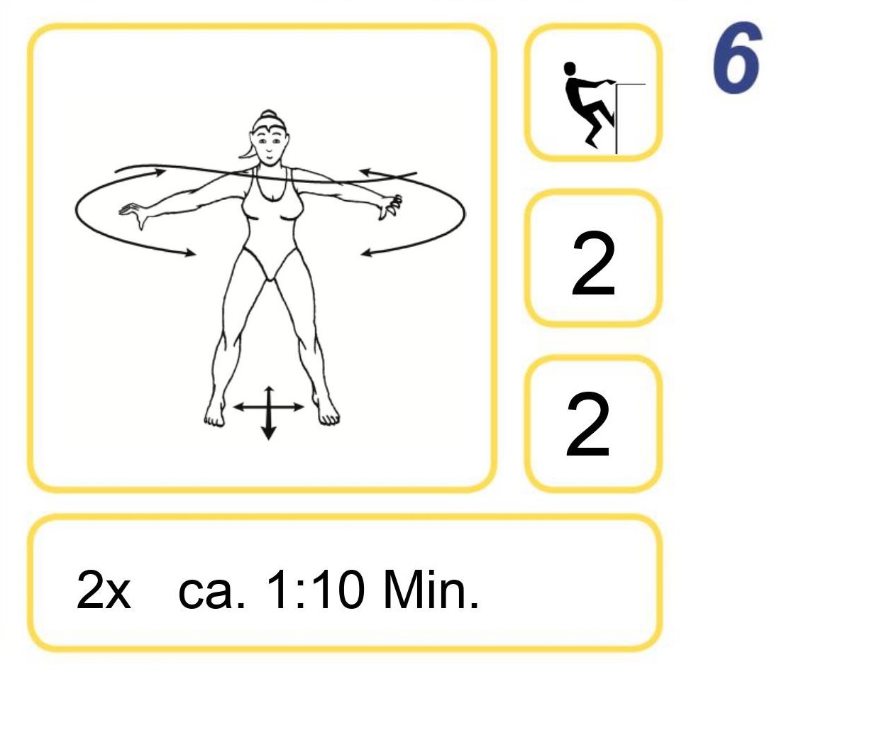 Übungstafel Übung 6 zum Aqua In Audiotraining Kurzprogramm, gelb umrahmt sind schwarze Piktogramme gezeigt; Butterfly am Beckenrand, Arme hüfthoch (2), Füße hüfthoch (2), Wie oft: 2x, Wie lang: 1:10 MinutenAqua In Übung Butterfly am Beckenrand